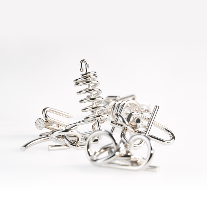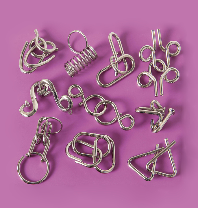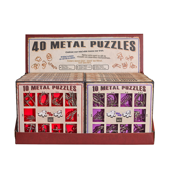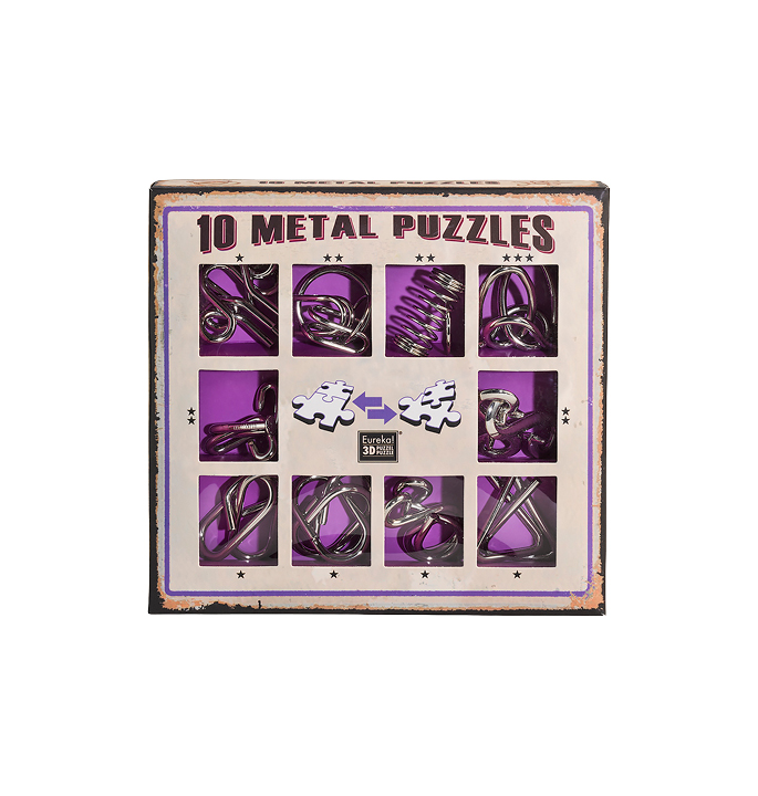 Deze set bevat maar liefst 10 metalen puzzels. Haal de onderdelen uit elkaar en breng ze daarna weer terug naar de startpositie. Elke set bevat een spiraalpuzzel, spijkerpuzzel, kleine gegoten puzzel, etc. Zo is er voor ieder wat wils. Ook zijn er verschillende niveaus te vinden in elke box: 1x *** moeilijkheidsgraad, 4x ** moeilijkheidsgraad 5x * moeilijkheidsgraad.