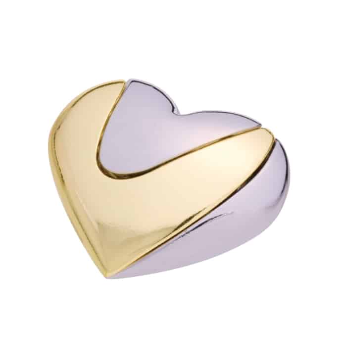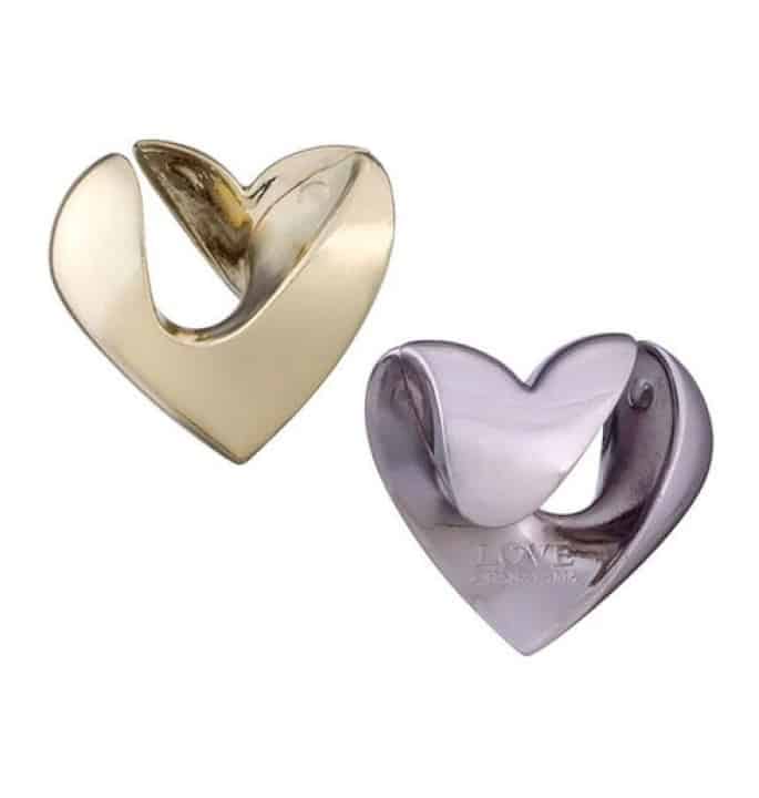 Twee stukken die naadloos in elkaar overvloeien om een enkele vorm te creëren. Pas de twee stukken zodanig in elkaar dat ze een prachtig hart vormen. Ontworpen door de Amerikaanse designer Scott Elliott.