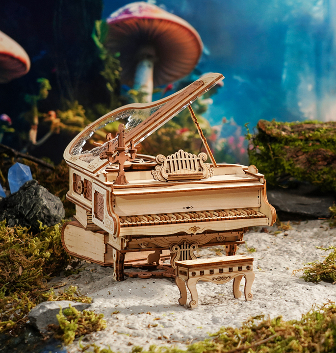 Das ROKR Magic Piano 3D Holzpuzzle AMK81 ist das neueste Produkt in der Serie der mechanischen Spieldosen. Es ist einem berühmten Konzertflügel nachempfunden und verfügt über eine einzigartige Selbstspielmechanik. Das Design hat einen Vintage-Look mit einem klassischen Flügel und magischen antiken Büchern als Unterstützung. Der transparente Acryldeckel ist mit schönen Mustern verziert, die an einen Kristall erinnern.