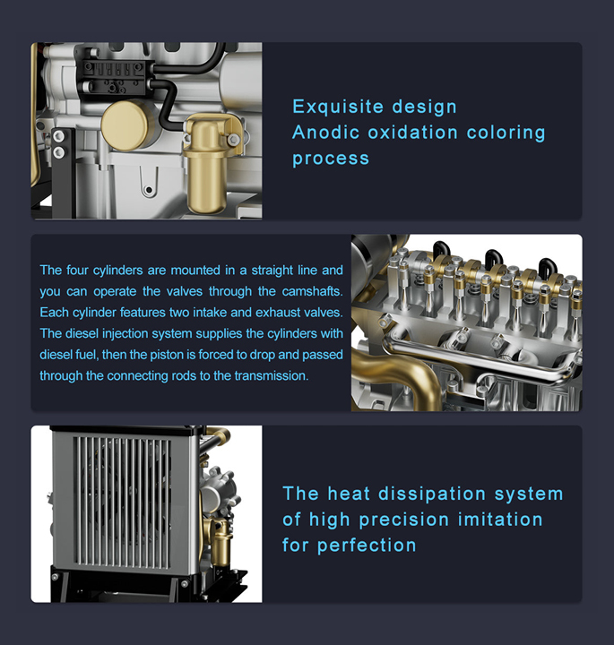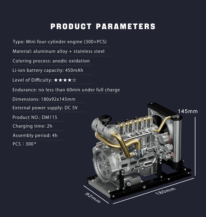 Der genial gestaltete Mini-Dieselmotor mit hochwertigen und extrem strukturierten Metallteilen vermittelt Ihnen die wunderbare Welt des Maschinenbaus in einer realitätsnahen Umgebung. Er kann an den Strom angeschlossen und vom Motor angetrieben werden, was für mehr Realität und Interesse sorgt. Sie können den gesamten Vorgang des Drehens des Motors beobachten. Der Bausatz besteht aus mehr als 300 Teilen und wird mit einer englischen Anleitung geliefert. Sie erleben persönlich den gesamten Prozess vom Zusammenbau der Kleinteile bis zum Endprodukt und dem Bau eines schockierenden Motormodells.