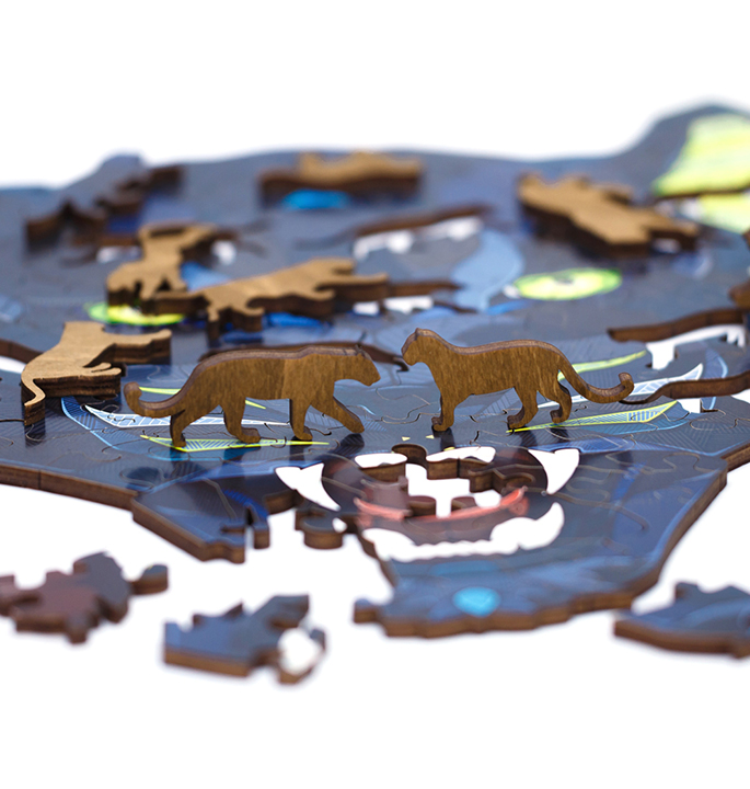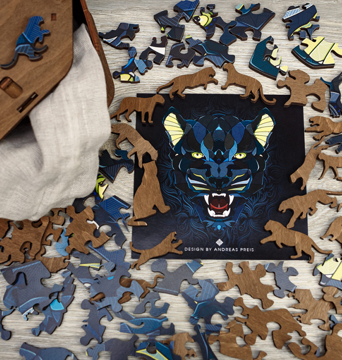 Farbenfrohes klassisches Holzpuzzle mit einer ungewöhnlichen Form von Elementen, die das Zusammensetzen noch spannender machen. Das einzigartige Design jedes Puzzles wurde in Zusammenarbeit mit Andreas Preis – einem deutschen Künstler, Designer und Illustrator mit großen zeichnerischen Fähigkeiten – entwickelt.
