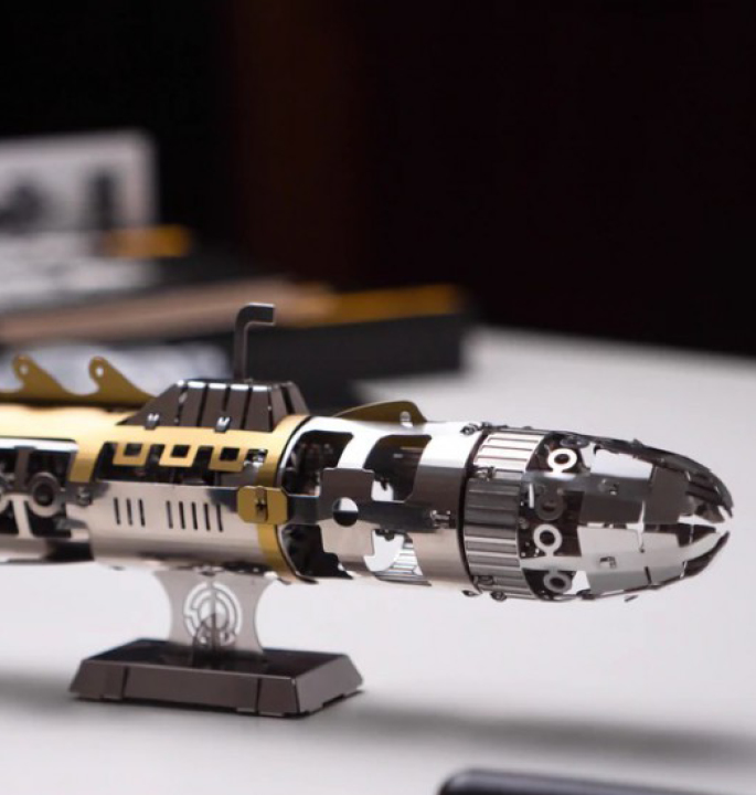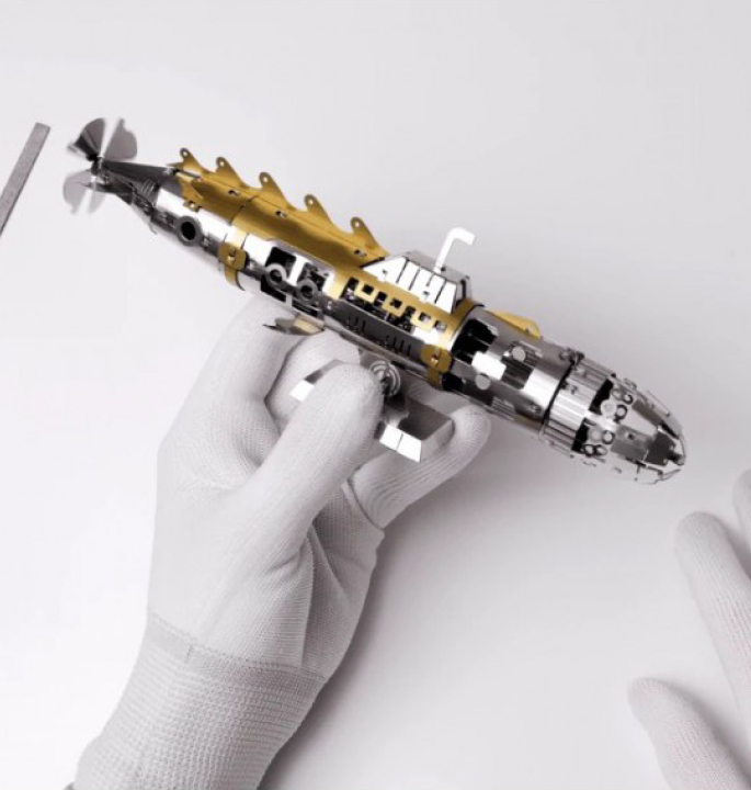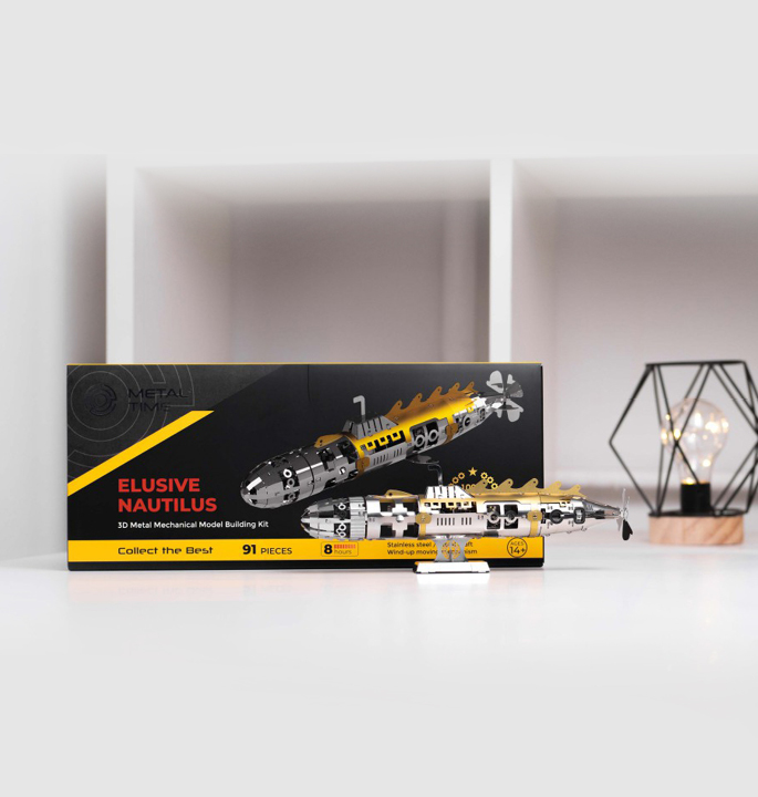 Baue diese Miniatur-Nautilus wieder auf und entdecke das Geheimnis der Unterwasserwelt. Das Modell „Elusive Nautilus“ besteht aus einem Federmechanismus, der durch Drehen der Nase des U-Boots aufgezogen wird. Dieser treibt den Propeller des U-Boots an. Genießen Sie das schöne Design und träumen Sie sich auf eine Unterwasserreise in Ihr eigenes Zuhause.