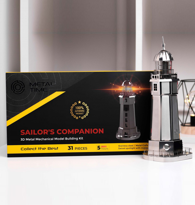 Die Konstrukteure von Metal Time waren daher hoch motiviert, das Leuchtturm-Modell zu entwerfen. Neben der dekorativen Funktion verfügt das Modell „Sailor’s Companion“ über eine Lichtquelle, so dass der Leuchtturm auch als Nachtlicht neben dem Bett dienen kann. Komm und nimm das Abenteuer auf dich, indem du diesen Leuchtturm baust.