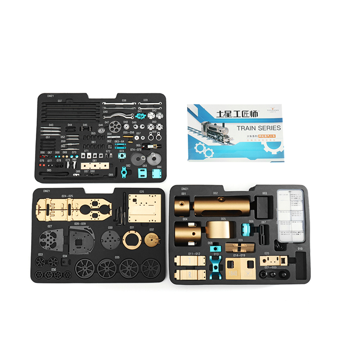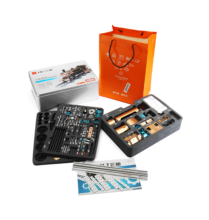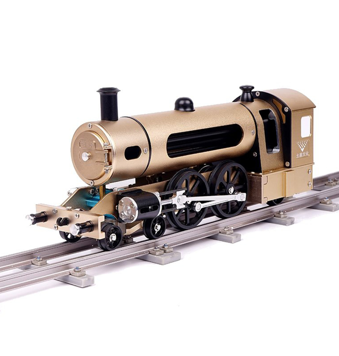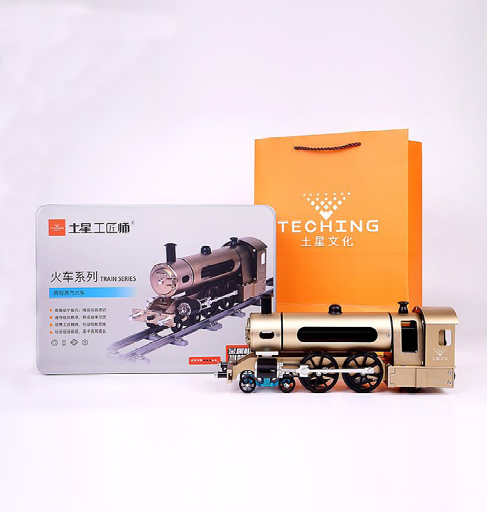 Im Jahr 1765 wurde in England die Dampfmaschine für den Einsatz in Fabriken erfunden. 1804 setzte ein englischer Erfinder zum ersten Mal Räder unter die Dampfmaschine. Das war eigentlich der erste Zug. Die erste Eisenbahn der Welt wurde 1830 eröffnet. Das war auch in England. Darüber fuhr die Rakete mit einer Geschwindigkeit von 50 km. pro Stunde. Der Bausatz enthält 1x Dampfzugmodell, Schienen, Akku, Ladegerät, englische Anleitung und eine Metallbox.