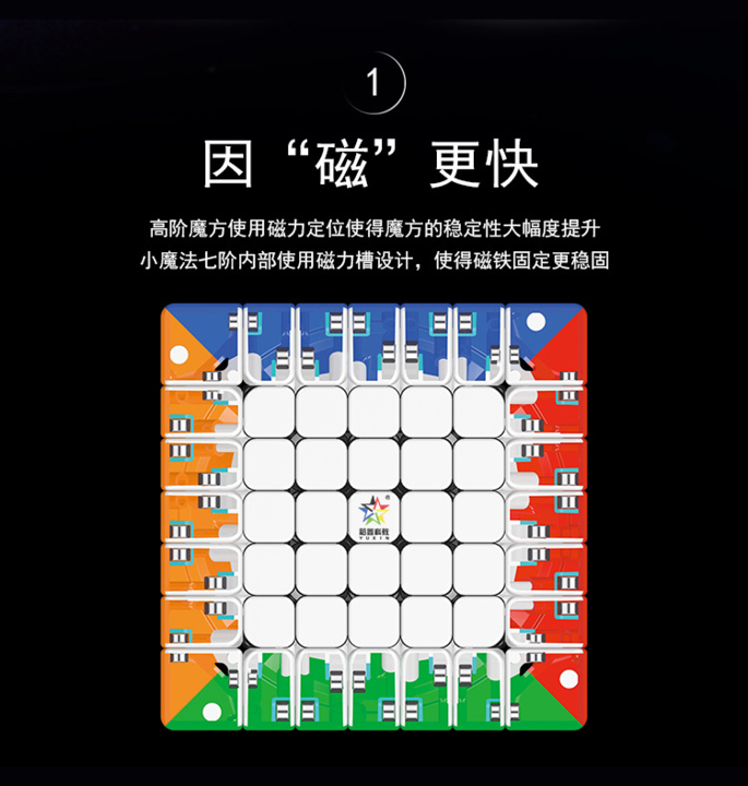 Der YuXin Little Magic 7×7 M ist ein neuer preisgünstiger magnetischer 7×7 Speed Cube. Dieser Würfel hat leuchtende, klebstofffreie, klare Farben, eine mittelstarke Magnetwirkung und lässt sich sofort nach dem Auspacken problemlos drehen.
