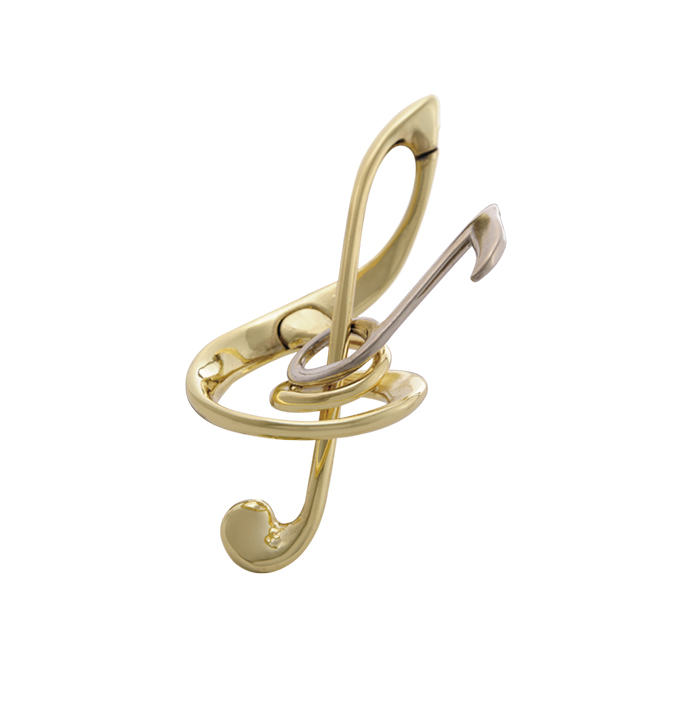 The musical key and an eighth note are intertwined in an interplay. The design, not immediately reminiscent of Harmony, is both beautiful and playful. Remove the note from the music key and then replace it. The theme of this Huzzle puzzle is “musical.” This Huzzle was designed by Russians Dmitry Pevnitskiy and Krill Grebnev