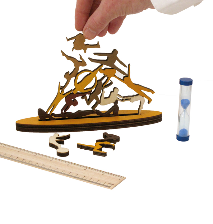 Why not play this game together with friends…? Take turns posting a piece. The last one to place a piece without knocking over the pile WINS! One-minute challenges. Who can stack the most pieces in one minute? Who can stack the highest in one minute? Supports the development of fine motor skills. Ruler and hourglass are included.