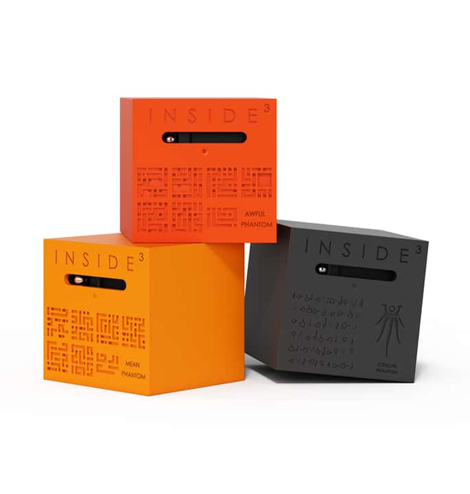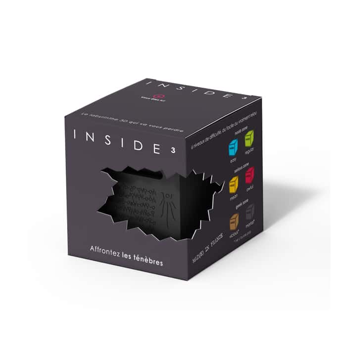 This cube contains a second marble (le phantom). No easy cube here. If you are not yet familiar with the INSIDE puzzles, start with the noVICE range or the 0 series first. ‘The Mean’ & ‘The Awful’ are difficult, but they can be opened. The Cthulhu is extremely difficult and does not open. With 7 trays of labyrinths to cross, on the other hand, they contain a second marble, walled up alive in a forgotten room of the labyrinth…. This ghost haunts the cube and makes the player’s life very difficult. However, it is possible to remove it to train, but that is cheating….