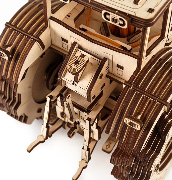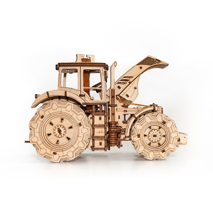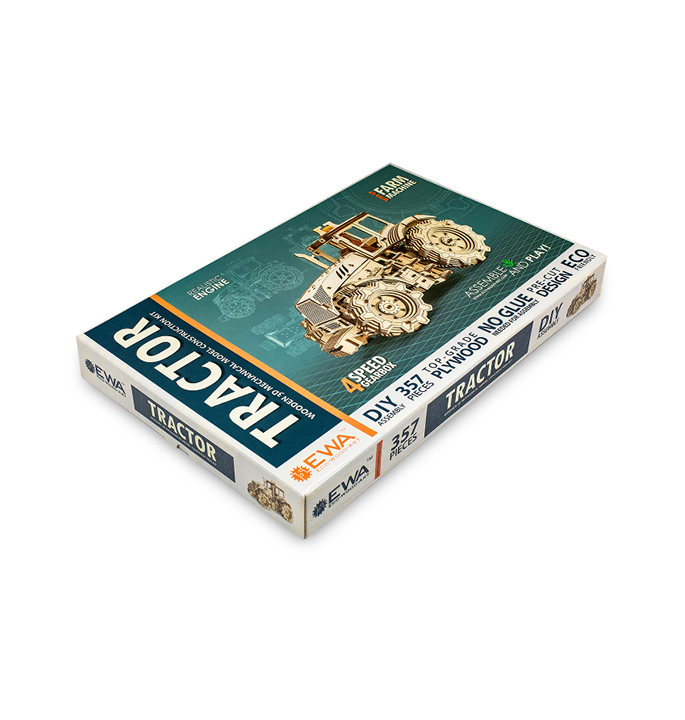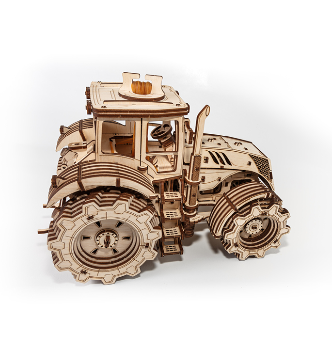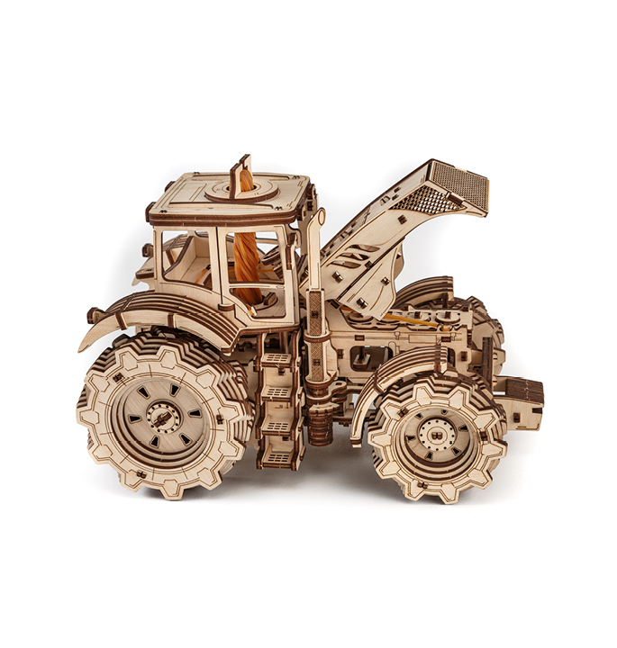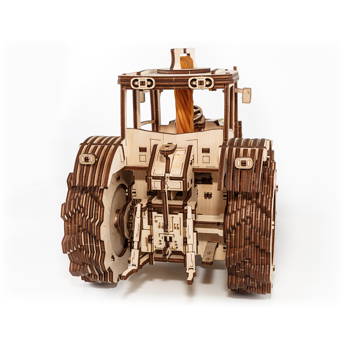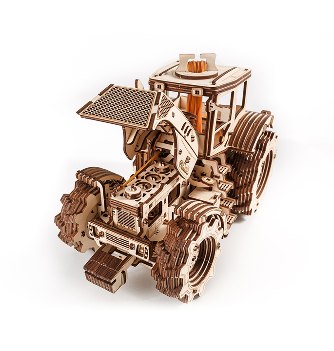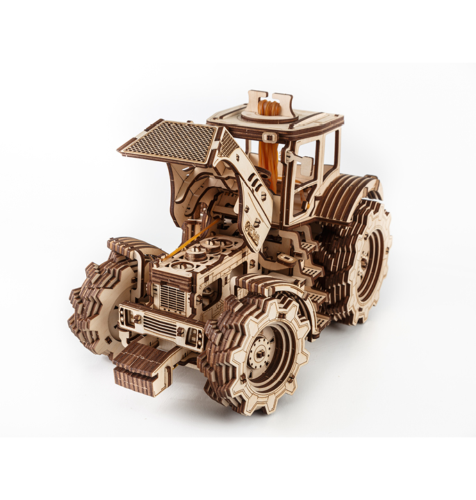 Mechanical wooden model agricultural machine with 4-speed shift system and visible 4 cylinders under the hood. The rubber band around the motor allows the model to move forward and backward at 2 speeds. Tractor including hood and doors that open.