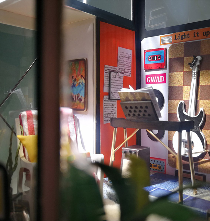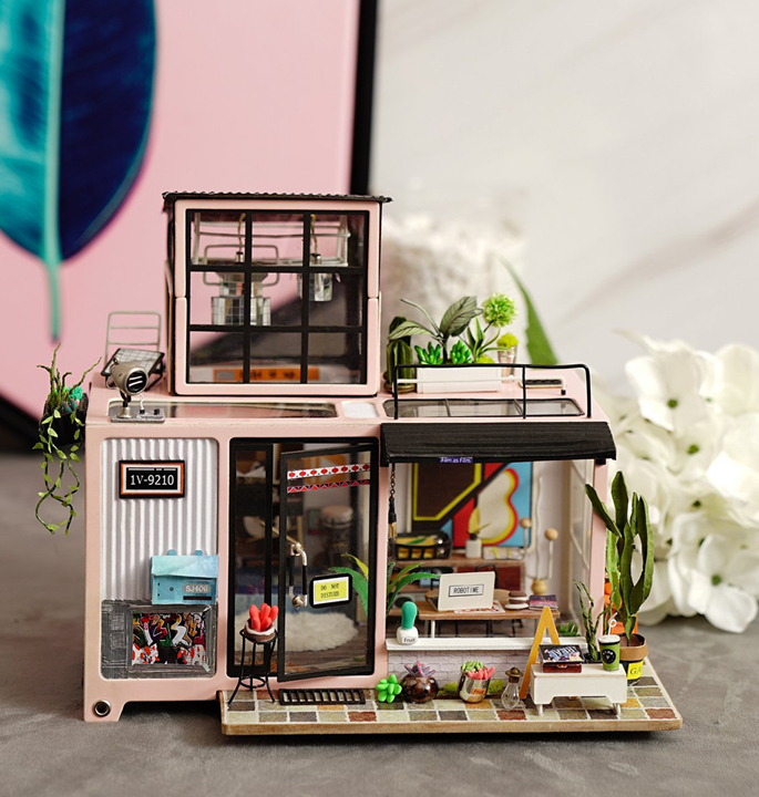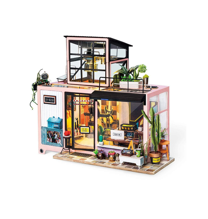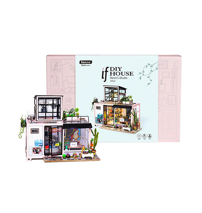 Robotime Kevin’s Studio DG13 is a miniature music studio in modern style that you can build with love. A lively music producing office with audio equipment such as guitar, CD players and stereo players, bass, speakers, electronic keyboard and African drum. Plants around the house also add a breath of fresh air to the dollhouse. So fun to make and great gift for family, friends.