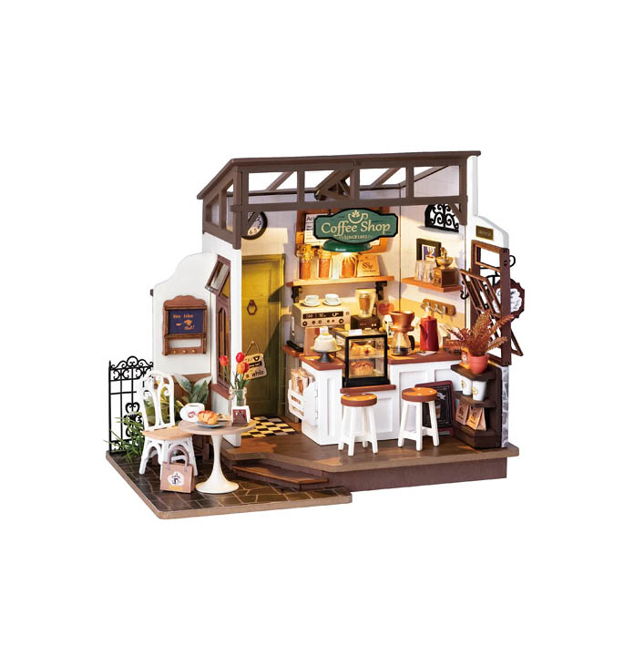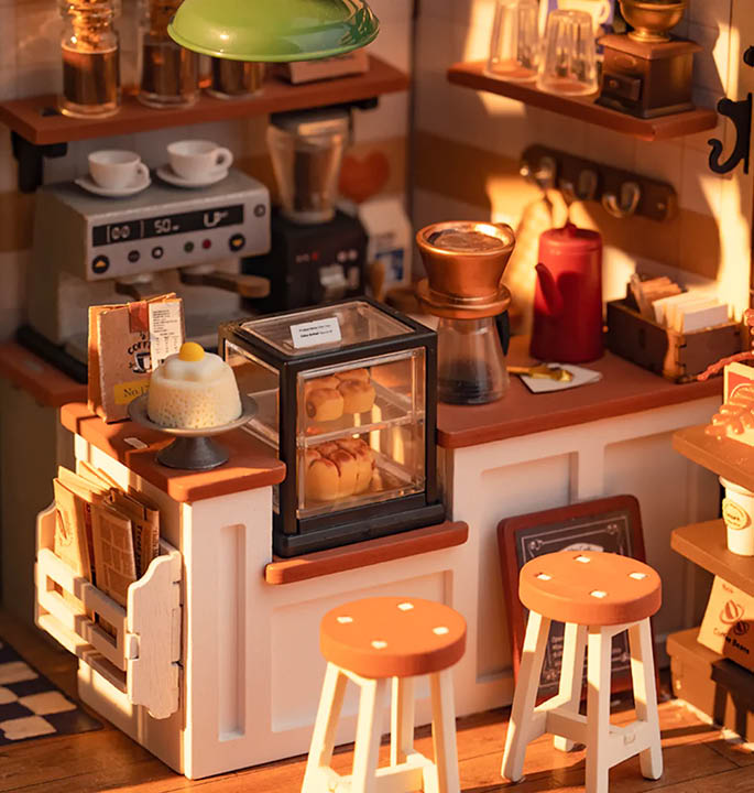 Step into the enchanting world of the Robotime Café Miniature Coffee House and get carried away by a warm, nostalgic atmosphere. It feels like an upscale coffee shop where you can completely unwind, enjoy and immerse yourself in a touch of retro charm. Inspired by classic coffee shops, this miniature house is full of beautiful wooden details that give the space a cozy, inviting feel.