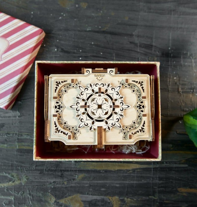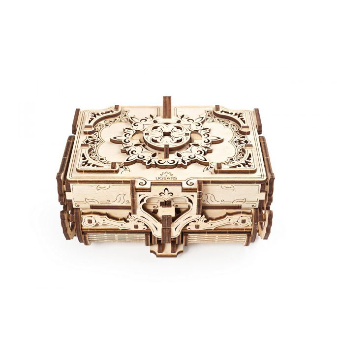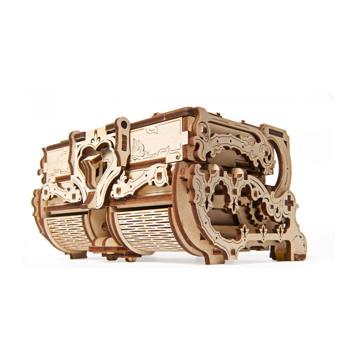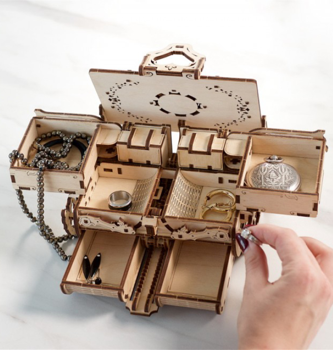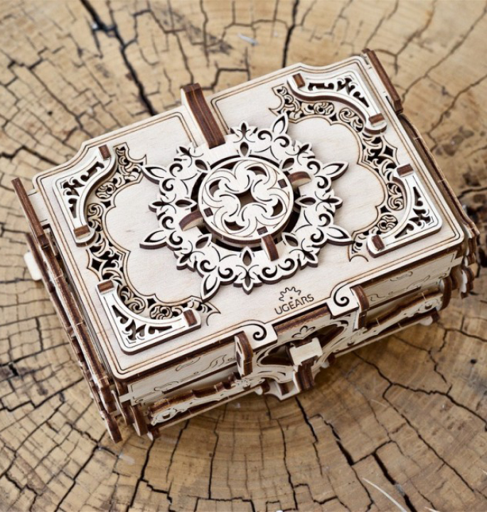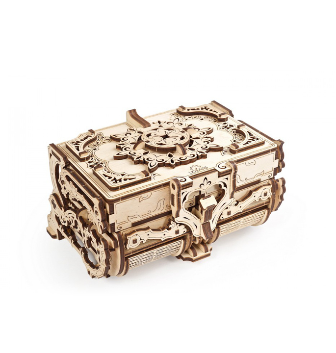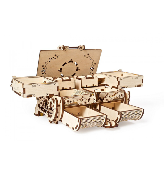 Delicate and beautiful. Designed to safely store your small valuables, such as jewelry, the Antique Case from UGears is a jewel in your collection. Besides its beautiful design, it has some exciting secrets, such as a unique mechanical to open the box. Pull the upper lever and activate three main mechanisms; 2 of them are mirrored on either side of the box that make the upper compartment move and rotate. The third mechanism allows the middle drawer to move. After this mechanical dance, you will have access to 6 compartments, ready to store your valuables. This unique, convenient and beautiful model kit for an antique box adds a beautiful decorative element to any home. Or is great to give someone as a gift.