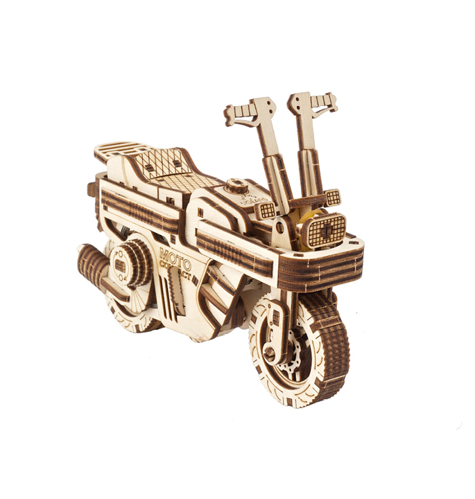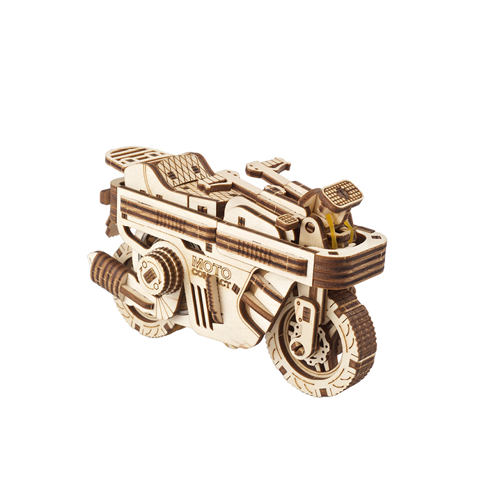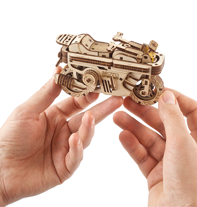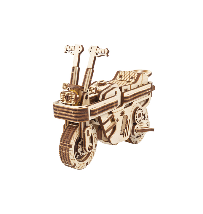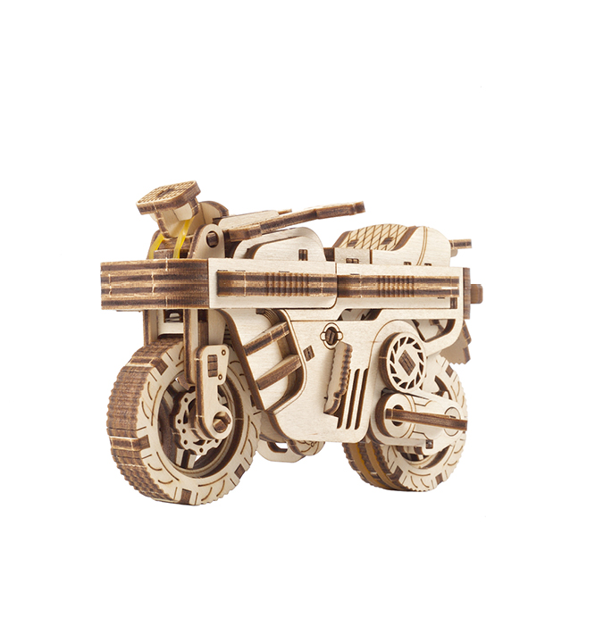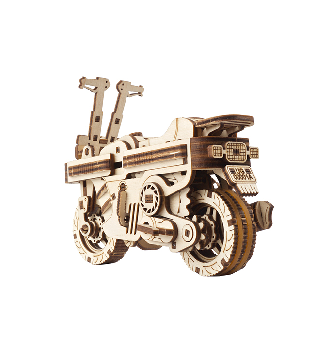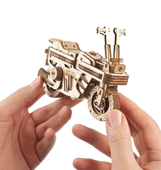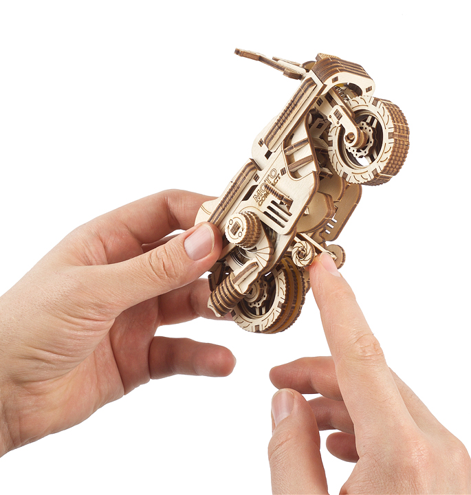 The folding scooter Moto Compact will appeal to anyone who enjoys two-wheeled transportation: bicycles, motorcycles and scooters. It joins the Ugears Motorcycle (a classic cruiser) and the Scrambler (a dual-sport bike) in our family of do-it-yourself wooden motorcycle models. Are there children (or adult children) who love motorcycles in your circle of family and friends? The Moto Compact folding scooter is a great gift idea for the next birthday or vacation.