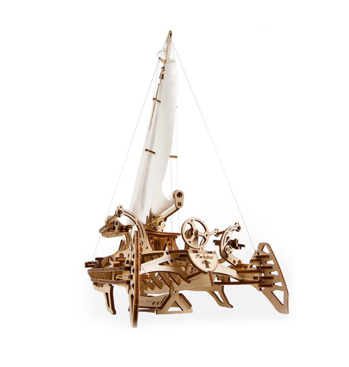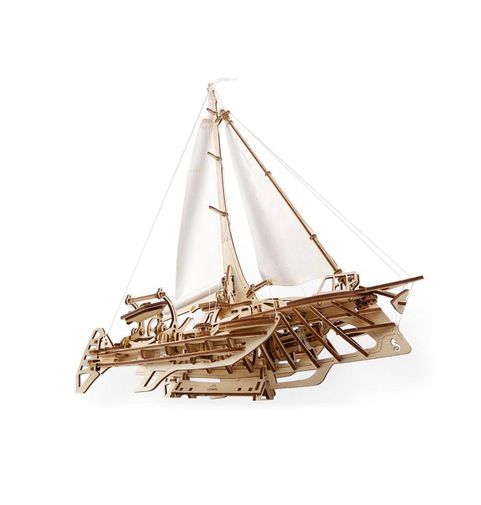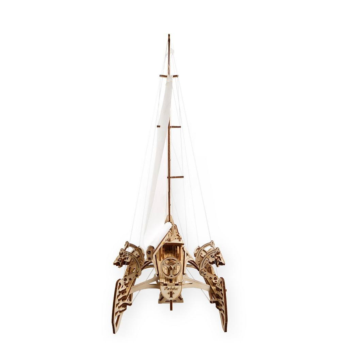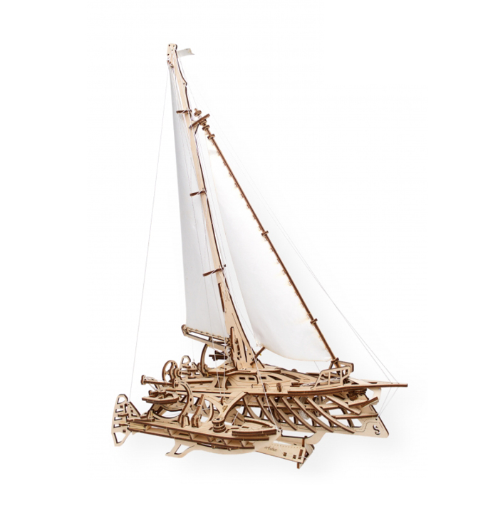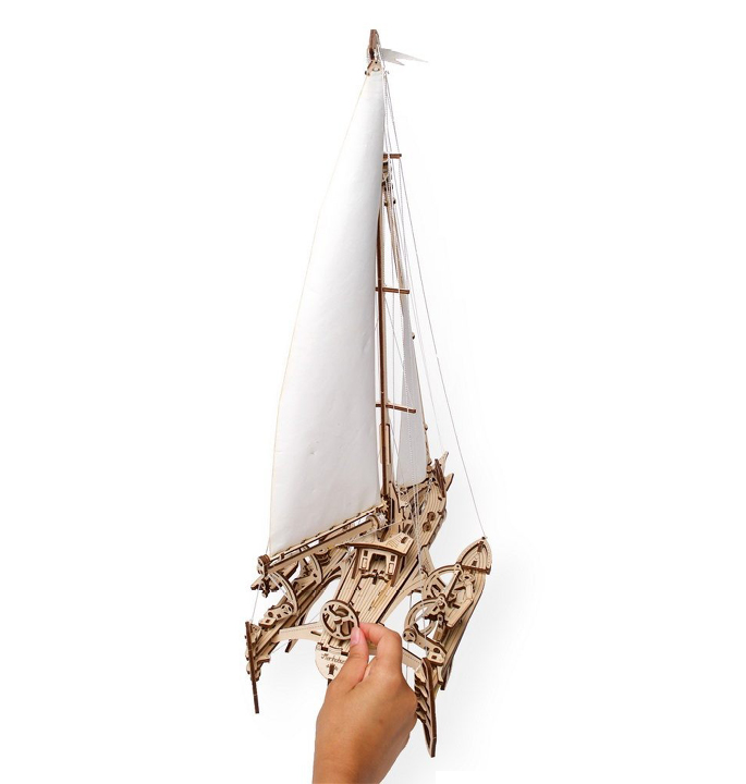 Let the wind carry you and sail away with this extraordinary graceful sea beauty. The Trimaran Merihobus from UGears is graceful and stylish. It is designed with many details like winches, rigging and hulls, making it a very realistic miniature copy of a real prototype. Because the body is made in a “skeletal” style, you can see how the mechanism really works. The model comes with several flag templates so you can shape your own design.