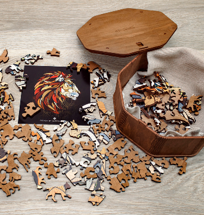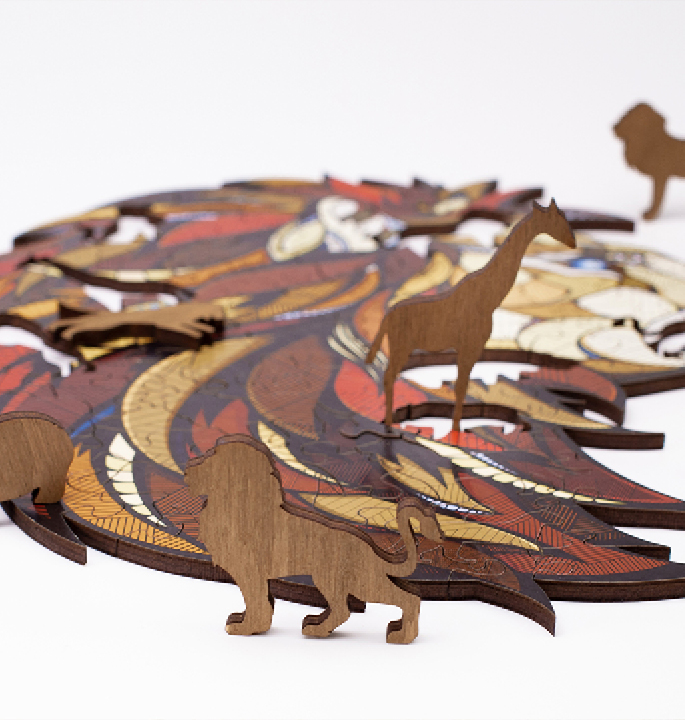 Colorful classic wooden puzzle with an unusual shape of elements that make the assembly process even more exciting. The unique design of each puzzle was created in collaboration with Andreas Preis – German artist, designer and illustrator with great drawing skills.