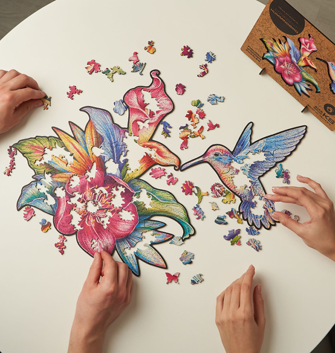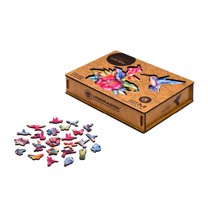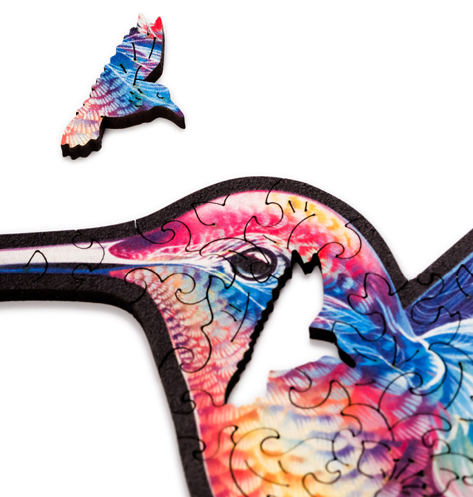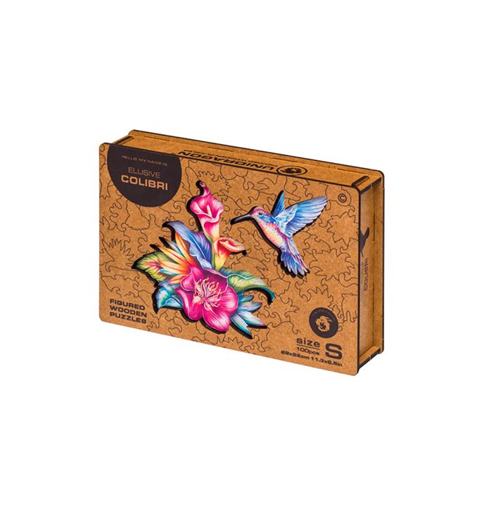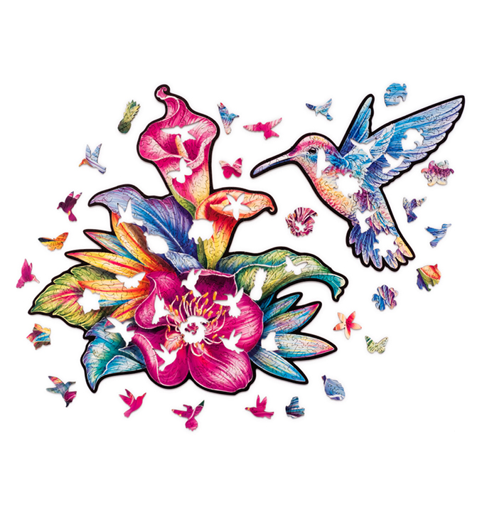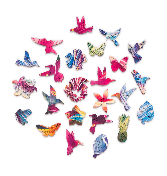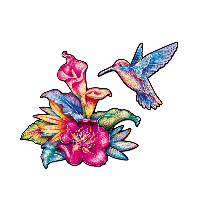 Imagine yourself in the tropics for a moment with this “Elusive Colibri” jigsaw puzzle. A colorful flower composition and a flying hummingbird await you! The beautiful colors, keep you looking at it. It looks like some kind of color therapy for your eyes! All the puzzle pieces are made in the theme of the puzzle. Think butterflies, flowers and birds… so you are really taken to a tropical forest.