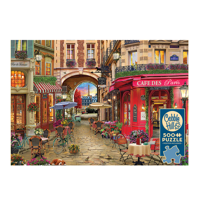 Cobble Hill jigsaw puzzle of 500 larger pieces featuring on the puzzle a street in Paris overlooking the Eiffel Tower and many cozy cafes.