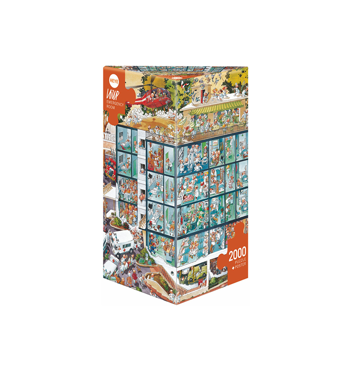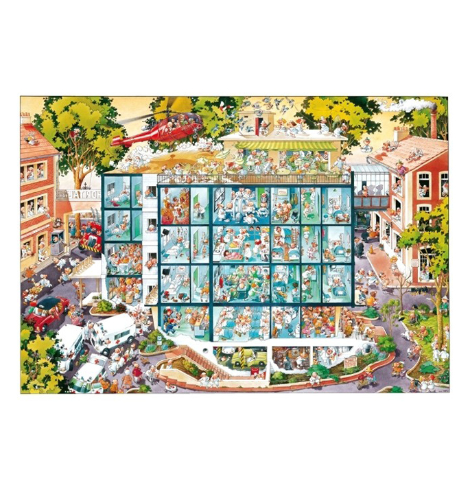 Heye jigsaw puzzle of 2000 pieces comes in a triangular box with on the puzzle a huge busy hospital where you can see inside all the rooms. Illustrator; Jean-Jaques Loup.