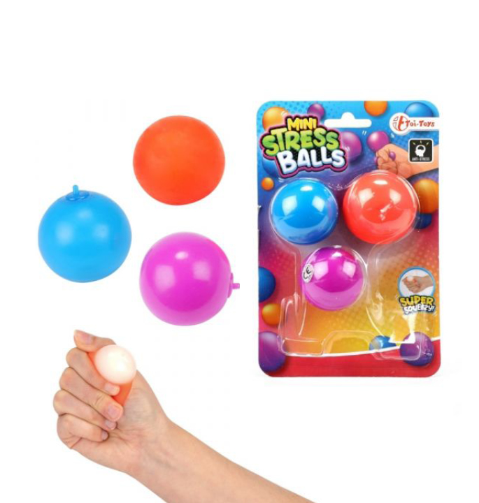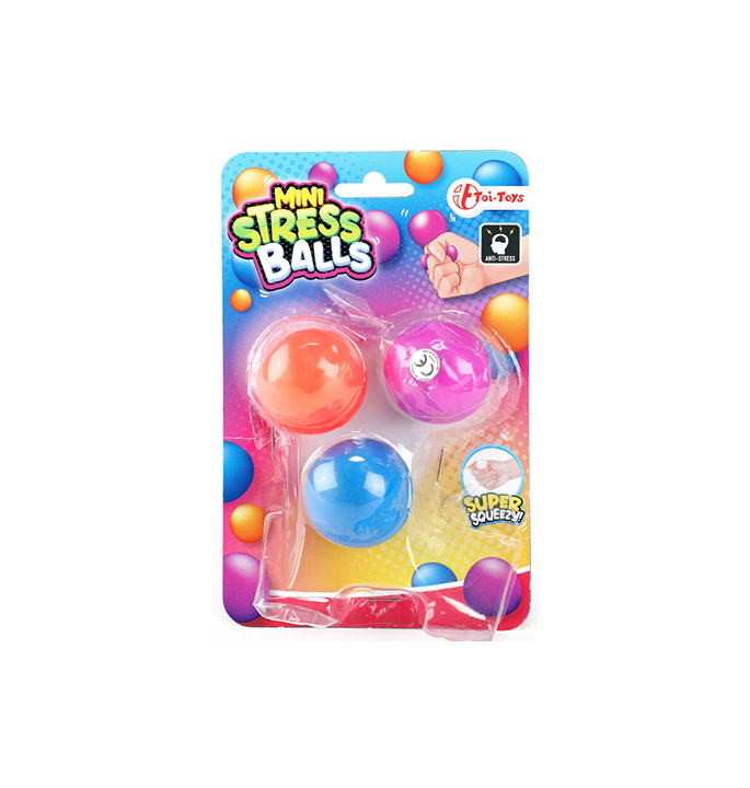 Stressbal Mini 3 Op Kaart Fidget. Drie kneesbare stressballetjes in verschillende kleuren. De balletjes zijn 5 cm groot en passen dus goed in de hand. Geschikt voor kinderen vanaf 3 jaar.