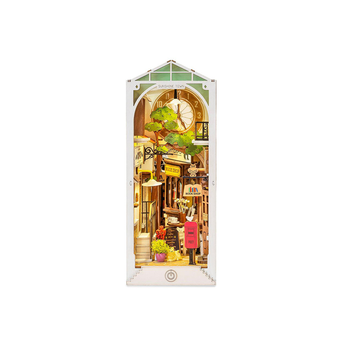Kom en bezoek Sunshine Town. Hier zul je genieten van een geweldige tijd in de koffieshop, boekhandel en meer. Robotime-Rolife Sunshine Town Bookshelf TGB02 Book Nook is een creatief 3D houten doe-het-zelf miniatuurhuis. We hebben je alles aangeboden wat je nodig hebt om deze ministadscène te bouwen. Met alle houten stukken en gereedschappen zul je geleidelijk de hele scène in elkaar zetten, zoals de winkels, weg, bomen, klok, enz. Deze boekensteun zal ook een unieke en prachtige decoratie zijn voor je boekenplank of interieur. Het ziet er geweldig uit als je deze in het donker zet met de warme lichten aan.