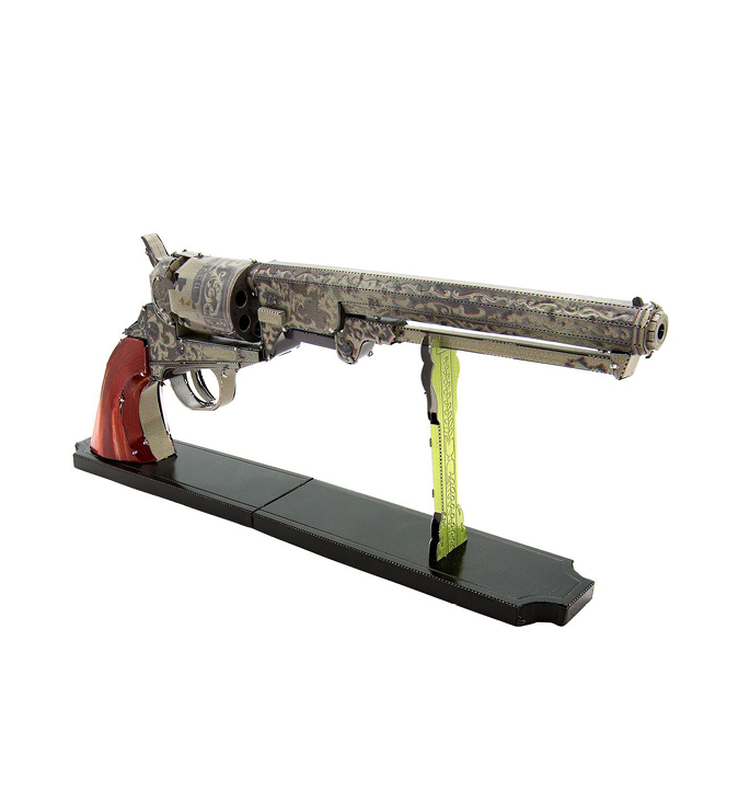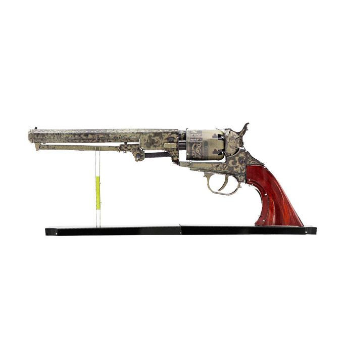Deze revolver werd in het wilde westen gebruikt. Het Amerikaanse wapen is afgewerkt met allerlei versiersels en een houten handvat. De identiteit en rijkdom van de eigenaar werden in een revolver vastgelegd. Met deze modelbouwset maak jij dit unieke pistool zelf na. De dun metalen platen zijn nauwkeurig gesneden met een laser. je vouwt de onderdelen zonder lijm zelf in elkaar.