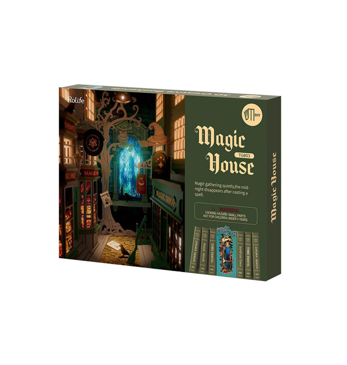 Welkom in de magische wereld. Bouw een magische bondgenoot met deze Do It Yourself Bookshelf. Maak je klaar om midden in de nacht te verdwijnen met een simpele spreuk! Robotime-Rolife Magic House DIY Bookshelf TGB03 DIY miniatuurhuis is een mysterieus magisch steegje, die alleen betreed kan worden door mensen die kunnen toveren. Hier kun je alle benodigde apparatuur en benodigdheden kopen om in de magische wereld te leven. Monteer nu alle 3D houten puzzelstukjes en bouw dit Magische Huis. Het wordt een super coole en unieke boekensteun. Het ziet er geweldig uit als je deze in het donker zet met de warme lichten aan.