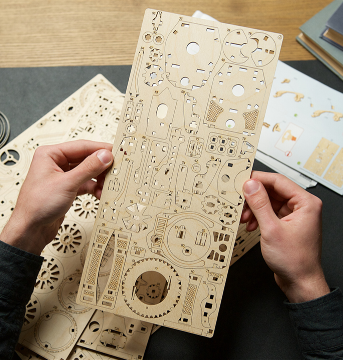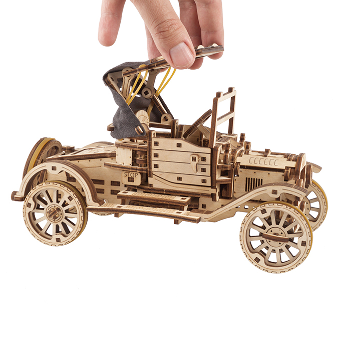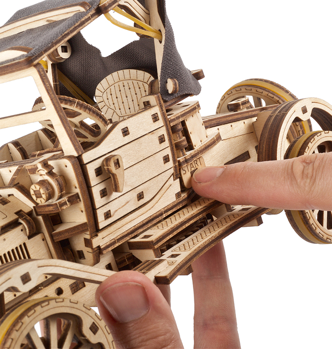 Het team van ingenieurs en ontwerpers van Ugears heeft een speciaal klassiek automodel ontwikkeld om terug te gaan naar die tijd. Opvallende kenmerken zijn het functionele cabrio-vouwdak met stoffen bekleding; vergrendelbare cabinedeuren die naar voren openen; de motorkap die aan beide zijden opent en een functionele 4-cilindermotor met krukas; een skeuomorfe slinger die het geluid van een rommelende motor simuleert; voorwielen die draaien met het stuur; en een reservewiel achterop. Om de Retro Car UGR-T te bedienen, zet u de Start/Stop-knop op “Stop” terwijl u de veer aangedreven motor opwindt met behulp van de ingebouwde ratelsleutel onder het chassis. Plaats het model op een plat oppervlak terwijl je het met één hand vasthoudt, druk op “Start”, laat het los en kijk hoe het gaat. De auto heeft vooruit, neutraal en achteruit versnellingen.