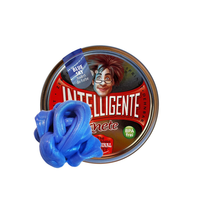 Deze putty ziet eruit zoals de blauwe lucht op een zonnige dag. De glinsterende blauwe kleur wordt prachtig wit in je warme hand en laat de wolken in het blikje aan je voorbij trekken. De Intelligente putty rekt uit als een kauwgombal, stuitert als een bal en scheurt zo gemakkelijk als papier. Deze putty zit verpakt in een mooi metalen blikje.