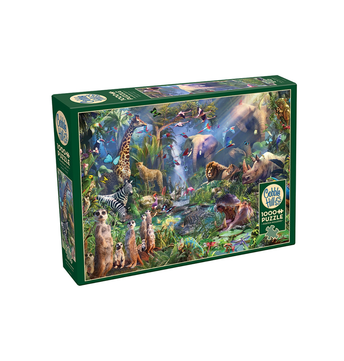 Neem een kijkje in de jungle! Leeuwen, cheeta’s, neushoorns, olifanten, giraffen, toekans, stokstaartjes en meer brullen in deze kleurrijke puzzel van 1000 stukjes. Er is genoeg te zien.. van jungledieren tot insecten!
