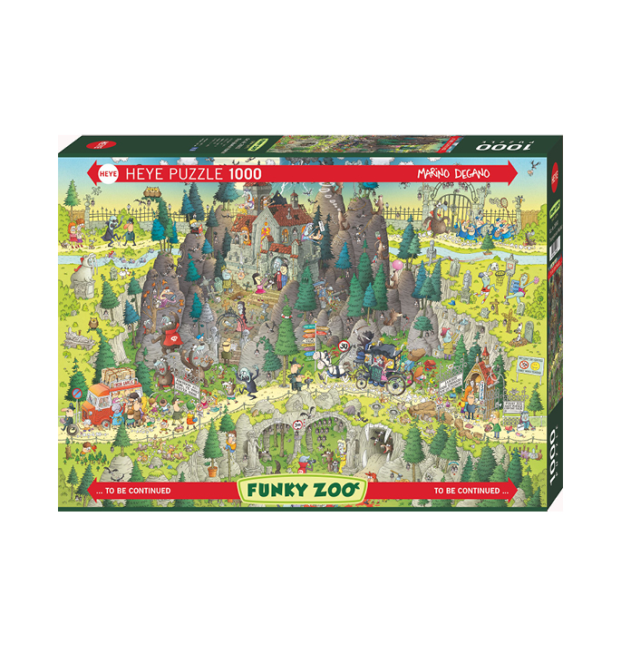 Heye Transylvanian Habitat Puzzel van 1000 stukjes. Weer een grappige plaat uit de Funky Zoo serie met dit keer een dierentuin uit Transsylvanië, vol weerwolven en vampieren. Cartoon artiest Marino Degano, heeft met zijn Funky-Zoo serie iets speciaals gedaan: de verschillende Funky-Zoo puzzels kunnen in elke combinatie naast elkaar gelegd worden. Zo kan iedereen zijn eigen dierentuin samenstellen!