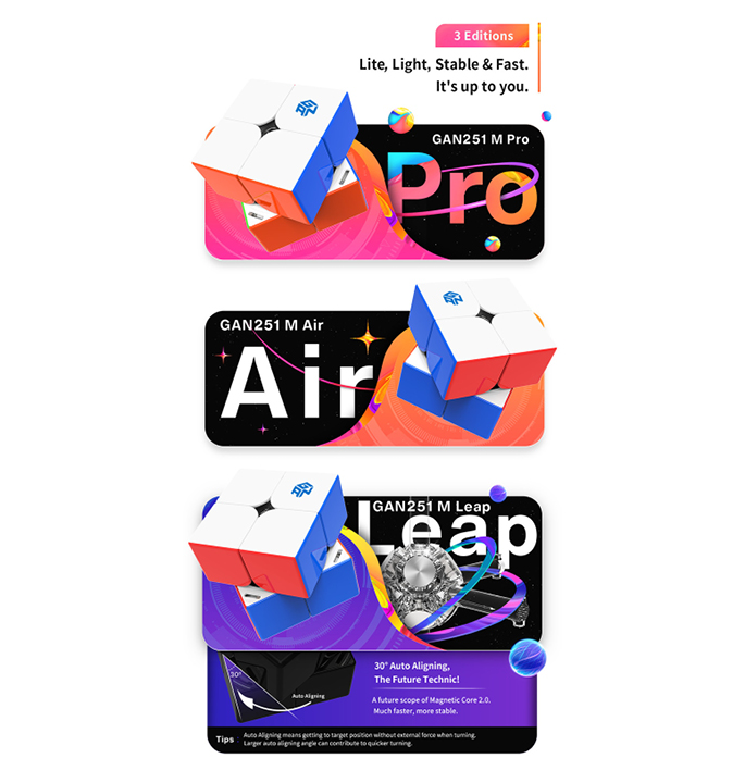 De GAN 251 M 2×2 is een update voor 2021 die voortbouwt op de vorige GAN 251. De Leap versie heeft een instelbare magneetsterkte en past het hoek-/kern magneetsysteem van de GAN 11 M Pro toe samen met de technologie voor “groothoek magnetische uitlijning”. Hierdoor schuift de cube verrassend eenvoudig op zijn plek.