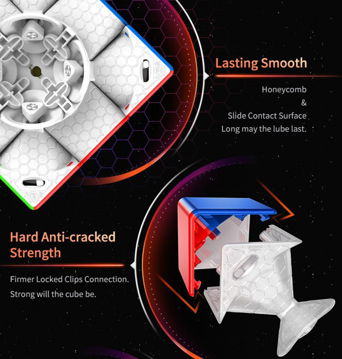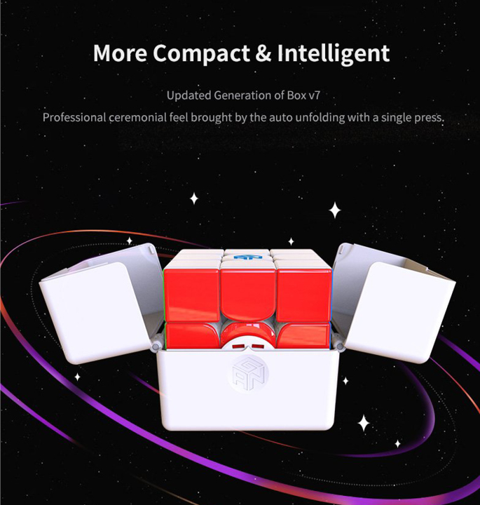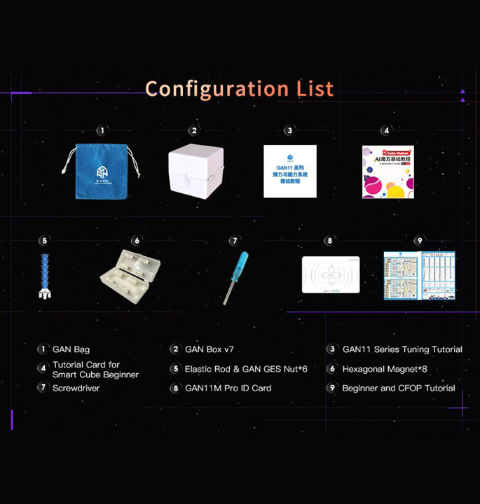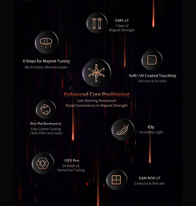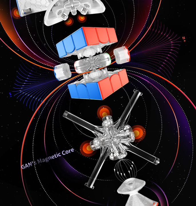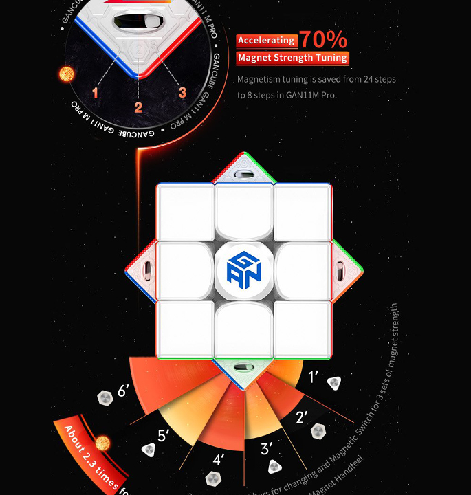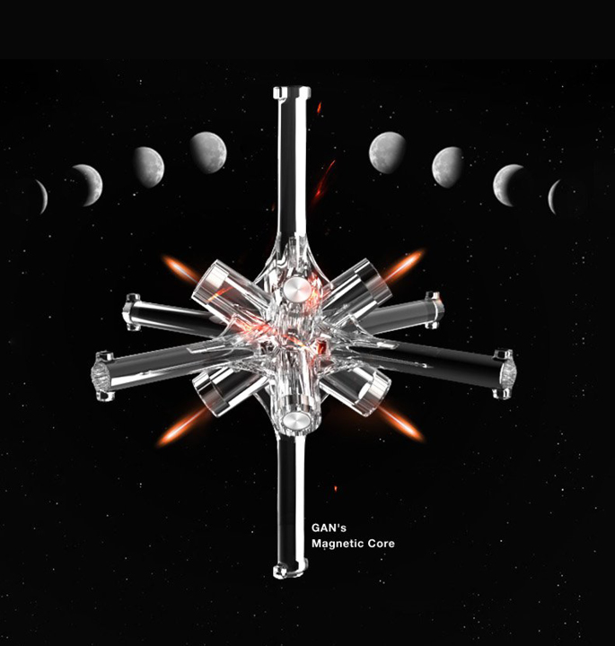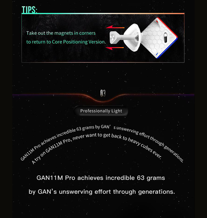 De GAN 11 M Pro is GAN’s 3×3 magnetische speedcube 2020 nieuwe paradepaardje! Het grootste kenmerk van de nieuwe GAN is de overstap naar een eerste hoek- kernmagneet positionering systeem. Samengesteld uit 64 magneten in totaal, is het gevoel van dit nieuwe systeem heel anders dan een traditionele hoek/randopstelling. De magneetsterkte van de kern kan worden gewisseld voor lichtere of sterkere magneten en de hoekstukmagneten kunnen eenvoudig worden aangepast door de “schakelaar” over te schakelen tussen licht, gemiddeld en sterk voor een maximale aanpassing. Dezelfde dubbele afstelkern die is ontstaan in de GAN XS is nu ook terug te vinden in de 11 M Pro en maakt 24 verschillende afstelvariaties mogelijk door middel van 4 opties voor elasticiteitsmoer en 6 opties voor veercompressie.